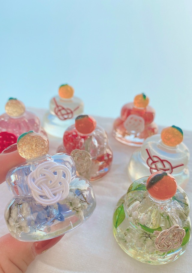 新年を迎える時にぴったりのハーバリウム鏡餅。 手のひらサイズで、リアルな見た目と特別感があります。 ハーバリウムならではの透明感と美しい輝きを楽しめる一品です。 一つ一つ手作りで制作されているため、オーダーメイドも可能です。 大切な方への贈り物や思い出の品として、特別な鏡餅を作りませんか?お好きなデザインや色合いも自由に選べます。 さらに、アクリル台のオプションもご用意しております。アクリル台に鏡餅を上品に乗せるだけで、一気に高級感が漂います。 特別なアクセントが、作品に洗練された趣を与えることでしょう。おしゃれな雰囲気と共に、素敵なインテリアをお楽しみください。 鏡餅は年末年始のお祝いに欠かせないものですが、ハーバリウムなら一年中飾ることができます。 お部屋のインテリアとして、一年を通して楽しめる飾り物としておすすめです。 手作りのため、実物と写真の色合いや形状に多少の違いがあります。商品の特性としてご了承ください。 鏡餅のサイズ 横4cm、高さ4.5cn アクリル台のサイズ 5cm×8cm×0.9cm *水引の色は完成した紫陽花鏡餅に合わせて、こちらで合う色を使用させて頂きます。